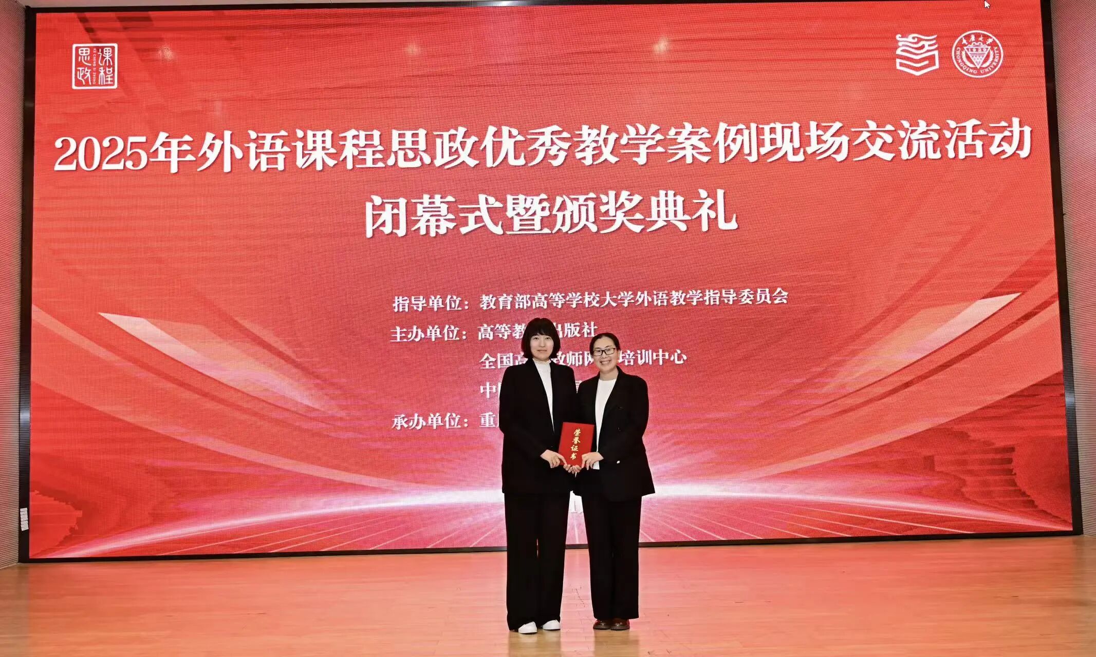 11月21日至23日,“2025年外语课程思政优秀教学案例现场交流活动暨全国教学比赛决赛”在重庆大学举行。基础部教师在此次国家级赛事中表现突出,斩获佳绩。英语系教师张墨和籍婷婷组成的教学团队荣获本科英语专业组全国特等奖第一名。这是我校在外语类国家级教学赛事中迄今取得的最好成绩,标志着学校外语课程思政教学实现了新突破。公共外语教研中心教师刘妍、任九菊、赵丽、李雪、佟丽莉组成的教学团队荣获本科大学英语组全国二等奖。两组教学团队在初赛中分别荣获本科英语专业组和本科大学英语组省级特等奖,晋级全国决赛。
