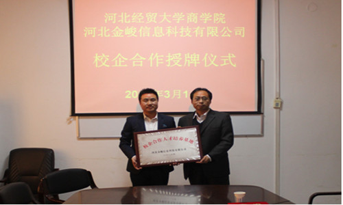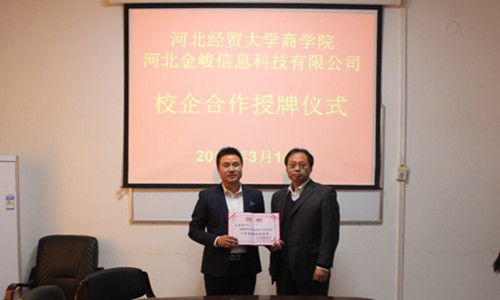 商学院与河北金峻科技有限公司校企合作授牌仪式于商学院会议室隆重召开。商学院院长王小平、电子商务系主任马书刚;河北金峻信息科技有限公司董事长王凤爽、董事长助理安鹏飞、企划部经理孙晓杰等30余师生出席授牌仪式,仪式由商学院党委副书记董爱民主持。