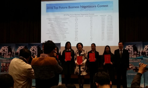 选手凭借着赛前的充分准备、扎实的专业知识和语言功底,沉着冷静、团结协作,最终表现突出,赢得了评委的肯定和赞赏,获得团体一等奖、陈超同学获得了“最佳谈判手”奖、刘晓鸾、闫红梅、杨柳婧老师获得了优秀指导教师奖。