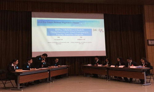 对阵的分别为对外经济与贸易大学和中国政法大学代表队。在谈判桌上,韩国色情片