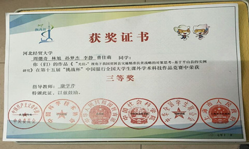 2017年11月,第十五届“挑战杯”全国大学生课外学术科技作品竞赛国赛在上海举行。由康学芹老师指导,周德奇、林旭等五人组成的新奇点团队,其作品《“光伏+”视角下我国贫困县实施精准扶贫战略的对策思考—基于平山县的实例研究》荣获“挑战杯”国家级三等奖。
