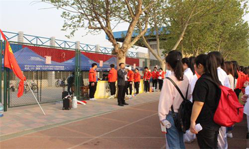 4月18日下午,商学院党委副书记董爱民在田径场为运动员、表演方阵成员150余人进行了赛前动员。