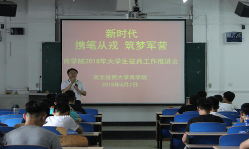 6月7日在第三教学楼B301教室,商学院举行“携笔从戎,筑梦军营”大学生征兵工作推进会,商学院相关领导出席,征兵工作负责人刘立宾老师主持,2017年退役士兵代表及200余学生代表参加。
