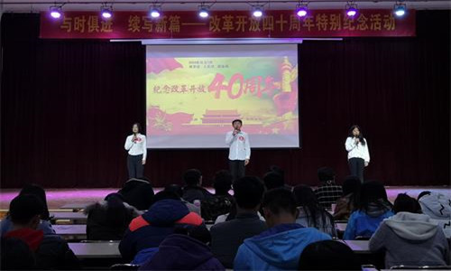11月16日晚,商学院在大学生活动中心3号厅举办“与时俱进,续写新篇”改革开放四十周年特别纪念活动。商学院党委书记马兵林,副书记董爱民出席,学院400余名师生参加。