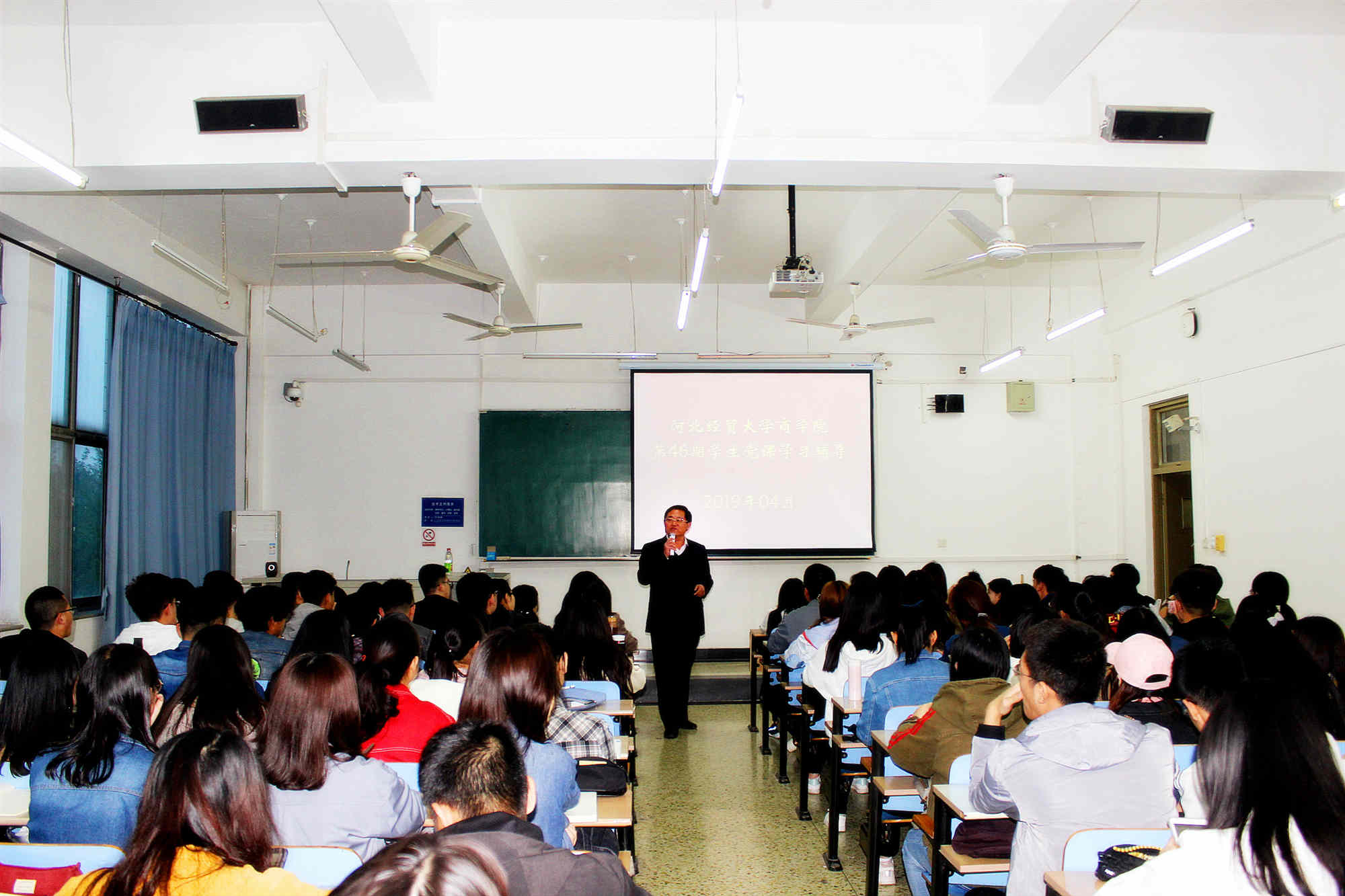 4月15日晚7:00,商学院第46期学生党课培训班在B教302教室开班,学院党委书记马兵林以“党的十九大精神与习近平新时代中国特色社会主义思想学习辅导”为题讲授了首场主题党课,全院入党积极分子100余人参加了培训。
