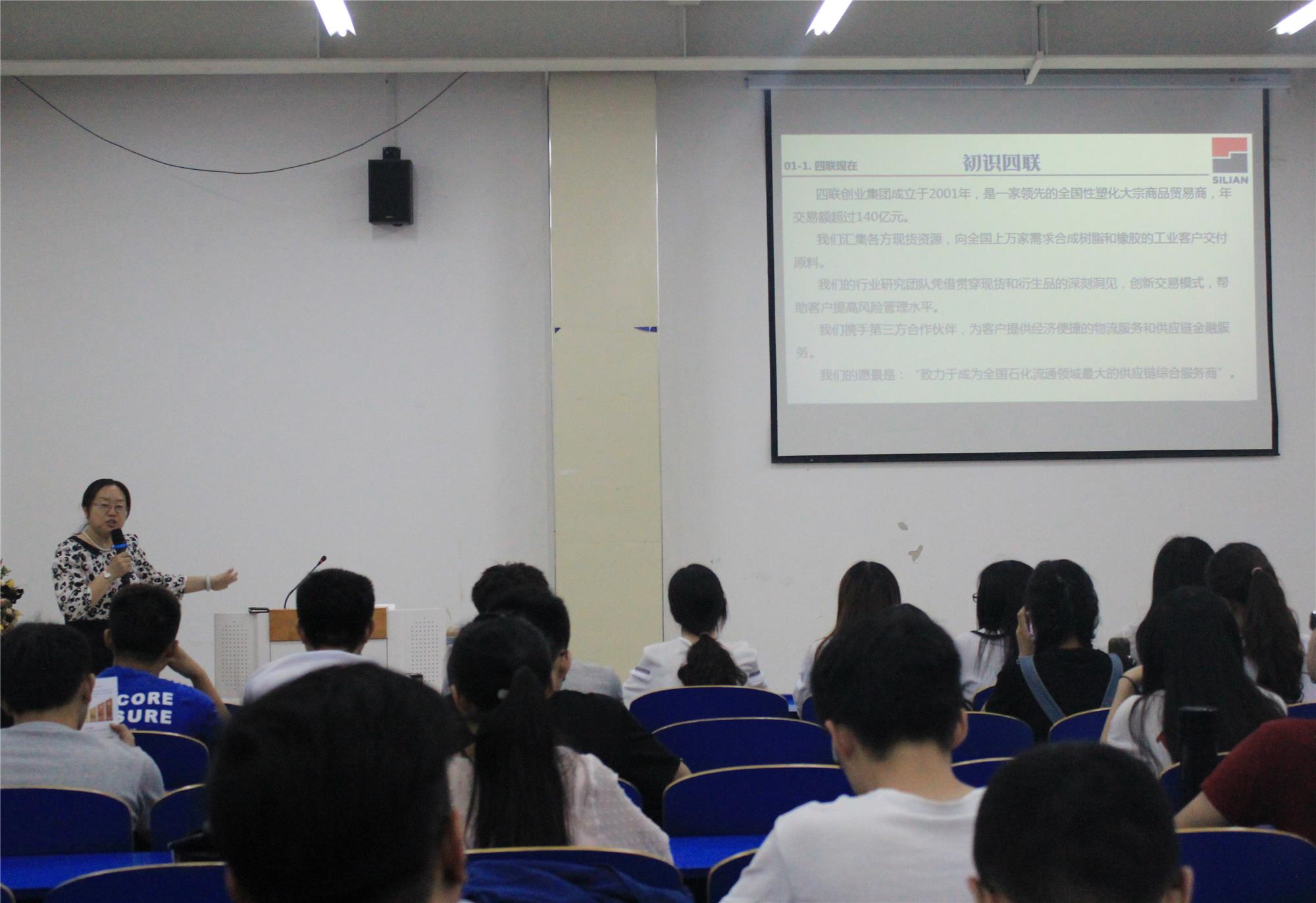 6月14日下午,商学院在就业报告厅举办了2019年暑期“启明星训练营”大学生实习宣讲会,邀请了北京四联创业化工集团有限公司人力资源部经理王小凤主讲,学院党委副书记董爱民、就业工作负责人李婷老师出席,来自商学院16级近100名优秀学生代表参加。