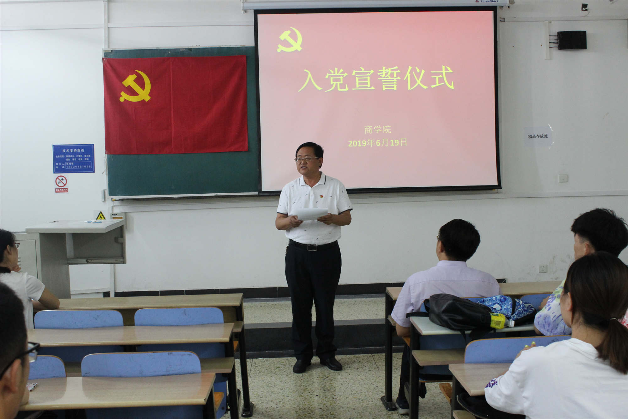 2019年6月19日中午,商学院在第三教学楼B302教室举行了学生新党员入党宣誓仪式。学院党委书记马兵林、副书记董爱民、各学生党支部书记及新发展的36名学生党员参加。宣誓仪式由学院党委办公室主任穆娟主持。
