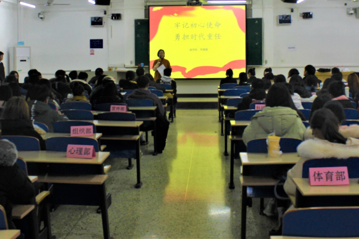 12月5日晚七点,商学院于北三教B301教室召开“牢记初心使命,勇担时代重任”专题宣讲会。商学院辅导员李珊珊主讲,商学院学生代表共150余人参加。