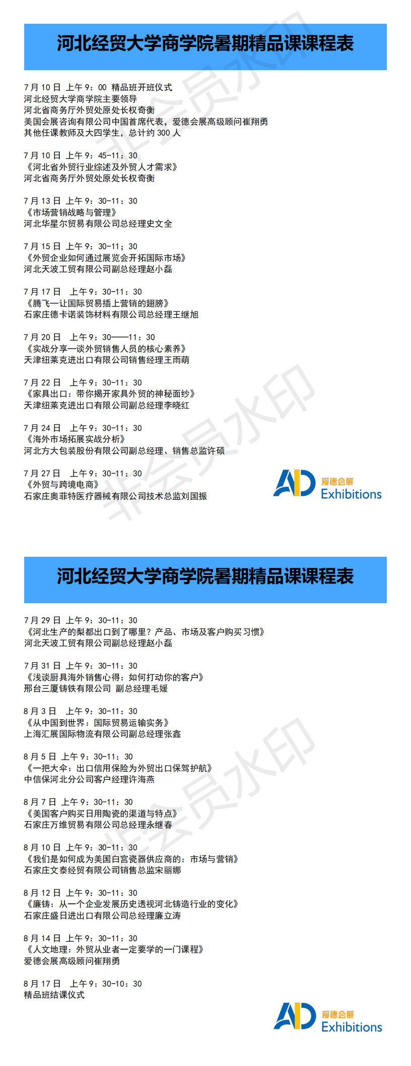 和爱德会展共同发起,旨在为河北省外贸行业定向培养国际贸易人才,解决中小外贸企业人才需求和高等院校毕业生就业需求,是校企合作的又一新模式。本次精品班的授课老师来自政府部门、知名外贸企业以及服务外贸行业的有关公司。授课教师均是从事外贸行业多年的精英人才。本次精品班授课内容以实战为主,突出实务操作。采取线上授课进行,课程设置共16次课,32学时,涵盖市场营销、产品知识、客户洽谈、客户关系、信用保险、出国展览、国际运输、跨境电商等。授课教师将运用丰富的外贸经验,为大家带来最有价值的知识技能。(供稿:商学院)
