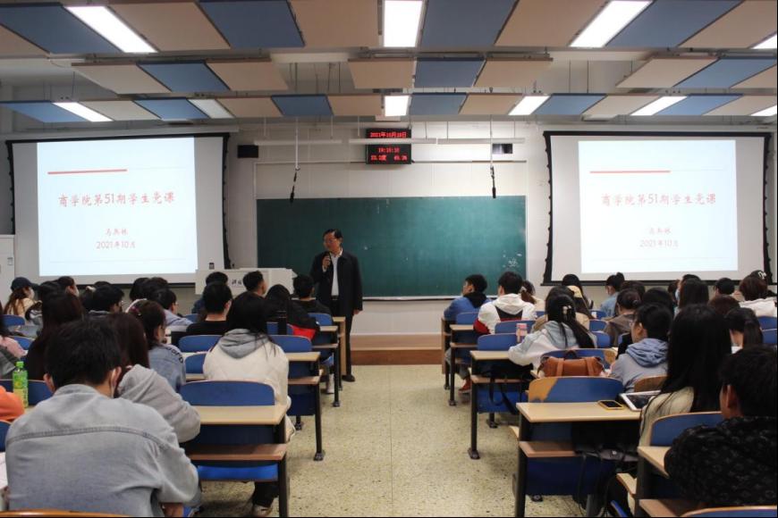 10月18日晚,商学院第51期学生党课培训班在北三教A301教室开班,学院党委书记马兵林讲授首场党课,全院入党积极分子近200人参加学习培训。