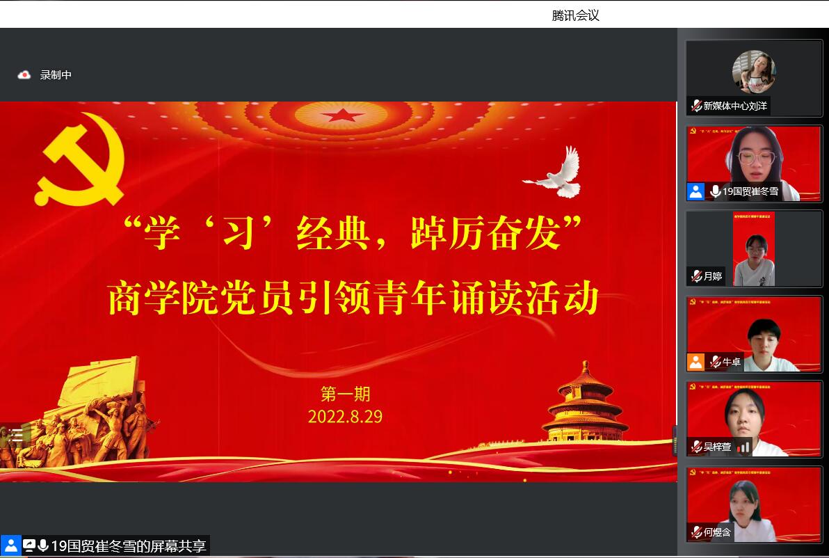 8月29日下午,商学院在线上举办“学‘习’经典,踔厉奋发”党员引领青年诵读活动,学院2022级新生辅导员、10名优秀学生党员代表和2022级全体新生参加了此次活动。