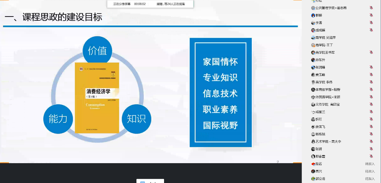 2022年9月16日下午,商学院在线举办了一期教学沙龙活动。活动主题是《<消费经济学>课程思政建设探索与实践》,由贸易经济系杜颖老师主讲。参加教学沙龙活动的来自各个学院的教师共计50余人。