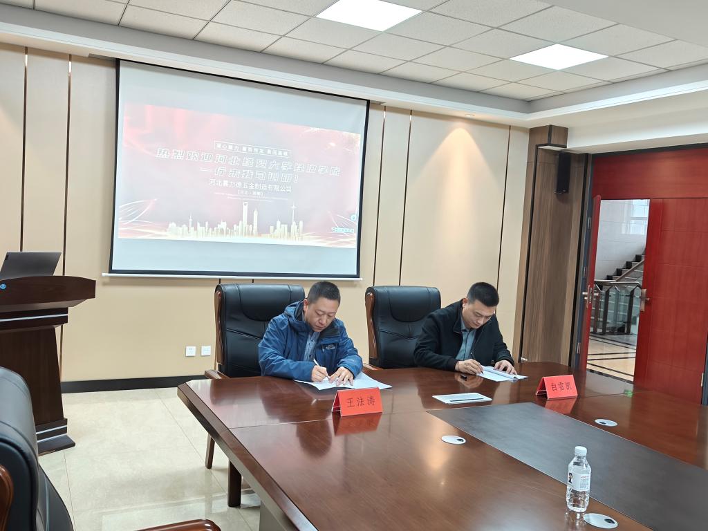 唐伟强介绍了永年区经济发展情况和紧固件产业基本情况,郭勇介绍了永年紧固件产业的生产现状、行业优势和市场情况,董茂通分享了永年紧固件产业的发展历史和行业特征。刘振滨介绍了学院的基本情况,王重润详细介绍了学院与当地紧固件产业集群合作的7个方面内容。校政企三方围绕学科建设、人才培养、科学研究、创新平台、实习就业等方面展开充分交流,深入探讨了下一步合作意向和合作模式,并达成一些初步合作意向。学院与喜力德五金制造有限公司共同签署了《校企合作协议书》。