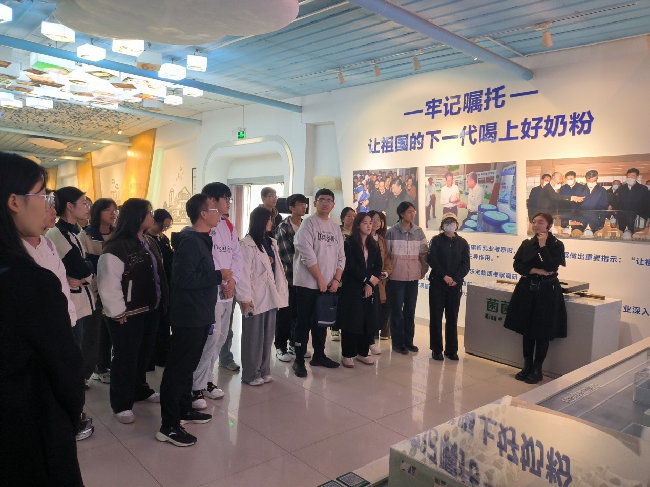 师生首先参观了君乐宝科普展览馆,讲解员周哲乐为大家详细介绍了奶源供应及母牛产奶的情况。君乐宝从酸奶业务起步,逐步扩展到婴幼儿奶粉、低温鲜奶、常温液态奶等多个领域,坚持全产业链一体化自有、自控,确保原料奶安全放心,并建立了世界级的研发平台和先进的牧场、工厂。君乐宝持续加大研发创新来优化产品结构,婴幼儿奶粉市场占有率不断提升,现已成为国产奶粉品牌的佼佼者。君乐宝还积极拓展海外市场,致力于将优质的乳制品带给全球消费者。师生接着在挤奶大厅近距离观察了母牛挤奶的全过程,直观地感受到了挤奶流程的机械化、自动化。老师和同学们对君乐宝的运营和发展状况进行探讨,并就参观前和参观中产生的问题进行咨询。