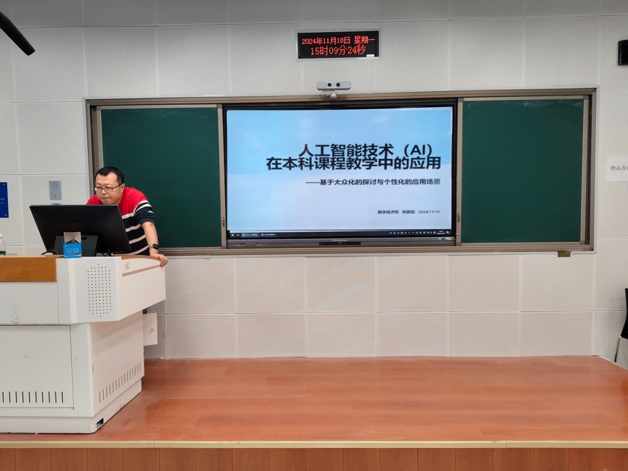 在B102举办了题为《人工智能技术(AI)在本科课程教学中的应用--基于大众化的探讨与个性化的应用场景》的教学沙龙活动。沙龙活动由数字经济系教师和彦鹏主讲,教学副院长单海鹏主持,全院二十余名教师参加。