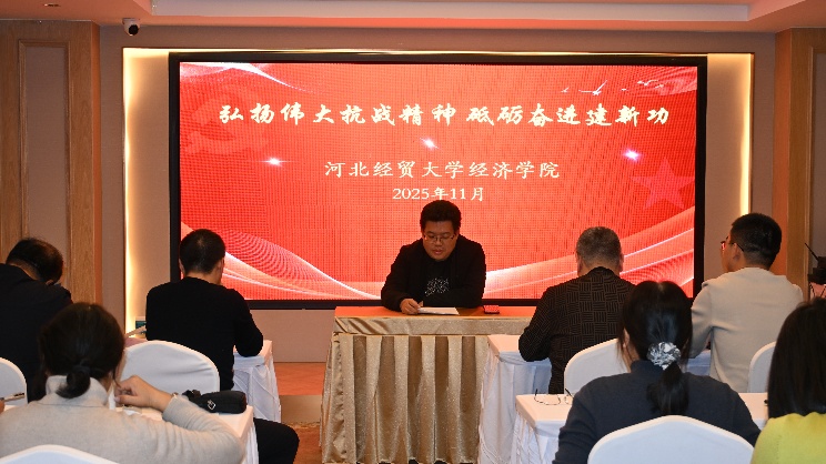随后,学院党委委员、经济学系教师党支部书记赵培红带领党员们深入学习了伟大抗战精神。通过学习,全体党员进一步凝聚了共识,淬炼了党性,并将把汲取的精神伟力转化为攻坚克难干事创业的实际行动,以昂扬斗志与实干姿态奋力书写学院各项事业发展新篇章。