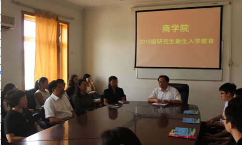9月8日上午,商学院召开2015级硕士研究生新生入学教育。商学院党委书记邢静义、院长王小平、党委副书记董爱民、副院长戎素云、副院长焦知岳、研究生管理办公室主任程丽梅和研究生辅导员李珊珊,以及商学院2015级全体硕士研究生参加。