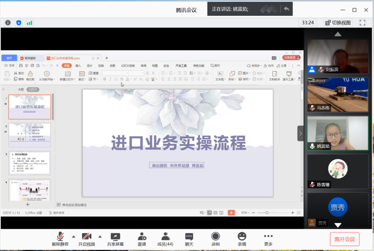 石家庄海关关税处副处长郭晓霞结合国务院稳外贸、稳外资工作部署,为参加社会实践活动的研究生重点讲解了石家庄海关近期开展的主要工作,使研究生们从政府层面了解了我国加快建设高质量对外开放工作的整体框架和工作重心。唐山燕山钢铁有限公司对外贸易部部长刘学佳、进口科科长姚蓝茹、驻曹妃甸港代表马志伟分别结合自身多年工作经验,从实体企业层面就近年来钢铁产业及燕山钢铁公司发展状况、铁矿石进口贸易实操、到港货物业务处理等内容进行了细致的讲解及港口实景展示。唐山燕钢的在线社会实践活动不仅使参加社会实践的研究生充分理解我国钢铁产业发展整体状况,还对钢铁原材料进口贸易各个环节操作有了充分的认识和理解。