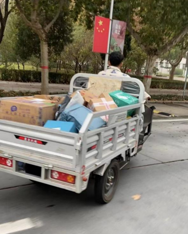 下午三点左右,实践部成员开始集中领取快递,一群勤劳的身影开始穿梭在校外一排排快递柜之间。随着一声声清脆的“咔嚓”声,同学们期待已久的快递就被实践部成员签收,并整齐地码放在三轮车中。回到学校,其他部门成员也积极帮忙将快递运输到13栋宿舍楼下,并仔细核对、分发给前来领取的同学。