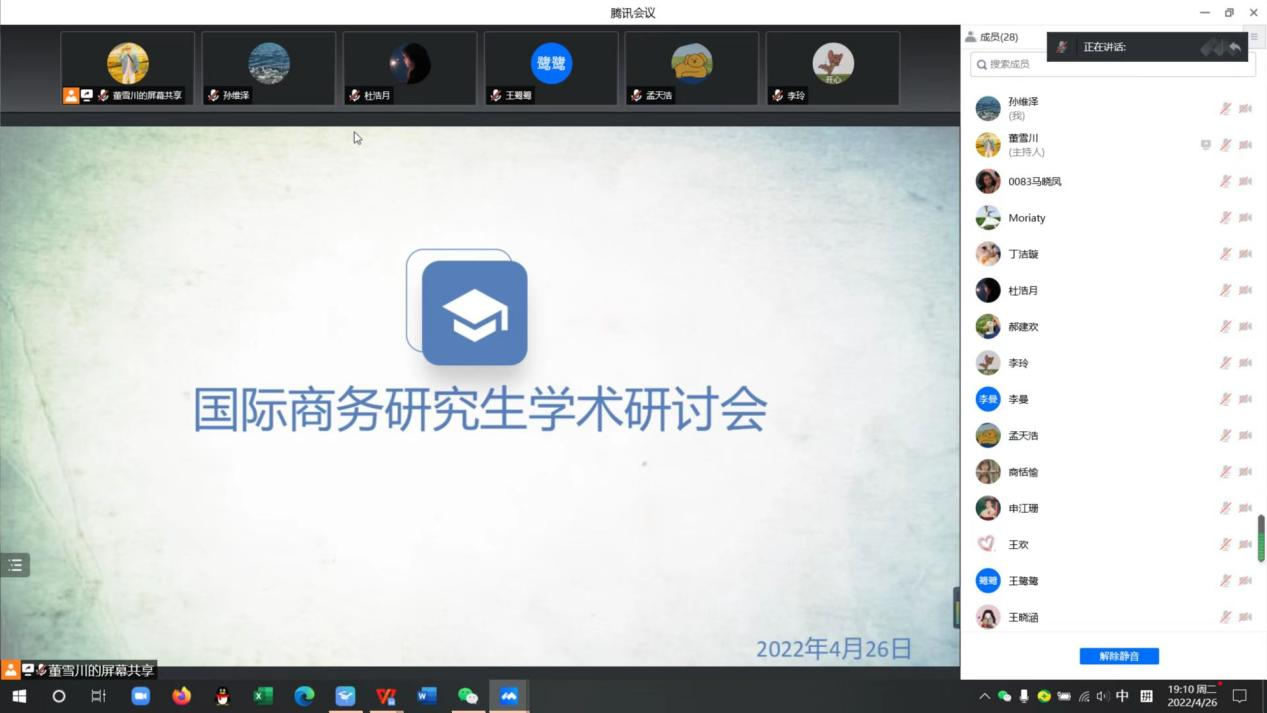 2022年4月26日晚上,商学院2021级国际商务研究生于线上举办了“商学纵横”之国际商务研究生论坛,2021级国际商务专业全体研究生参加了此次学术研讨会。
