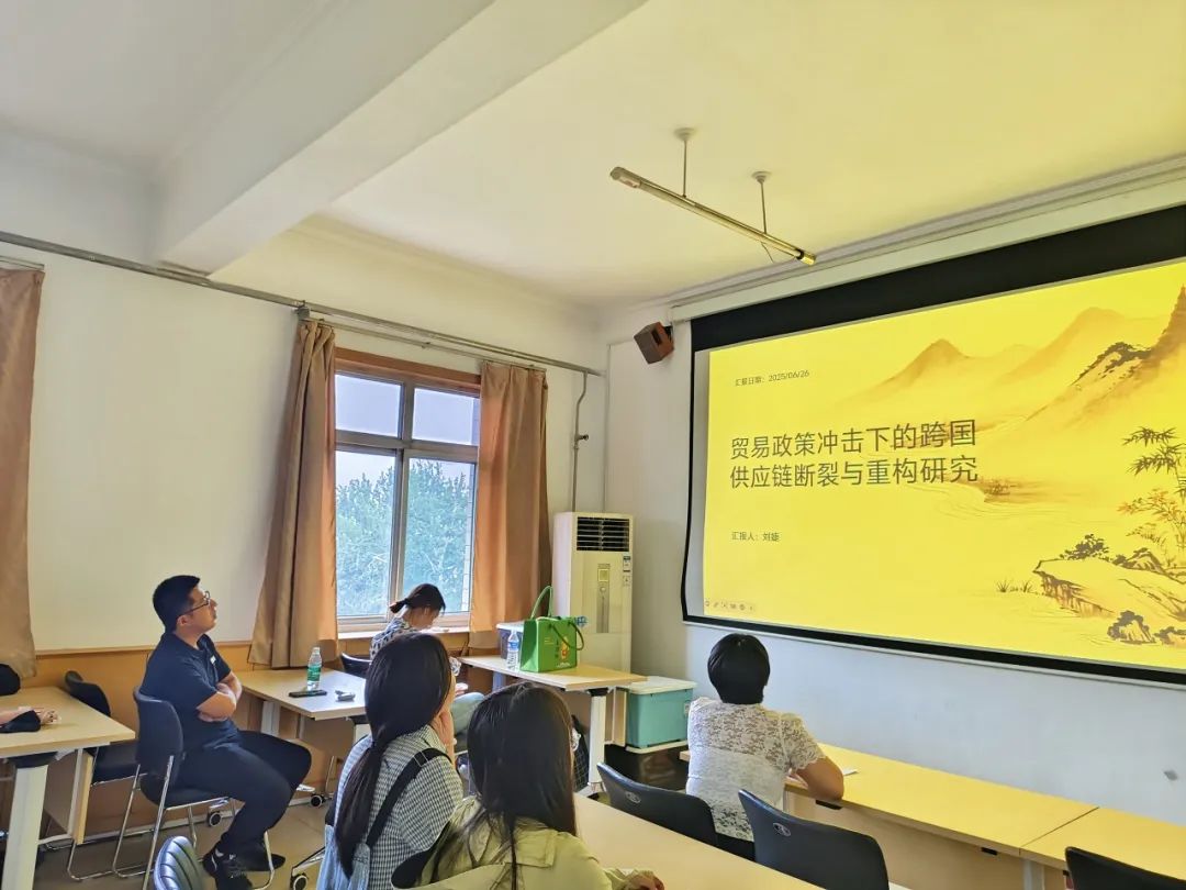 其次,刘婕同学分享了一篇来自《经济研究》的文献,题目为《贸易政策冲击下的跨国供应链断裂与重构研究》。通过分析贸易政策冲击带来的影响,发现其不仅影响贸易流动,还对企业行为产生影响。而现有文献广泛地探讨了外部冲击对供应链的破坏性影响以及企业的应对策略。结合以上分析,刘同学讲解了文章的理论框架,包括供应链断裂与重构的权衡和供应链重构的策略。在实证分析部分,文章以2017年1月至2019年12月中国供应商与海外客户的供应链关系作为研究对象,通过构建多期双重差分估计模型,来考察来自美国的贸易政策冲击下中美跨国供应链关系的断裂概率。基准回归结果表明,美国加征关税提高了中国企业海外供应链的断裂风险。最后,刘同学展示了文章的政策建议,分别为:强化全球战略规划与政策协调、推进制度型开放、加大对企业数字化赋能的支持力度以及持续推进统一大市场建设。