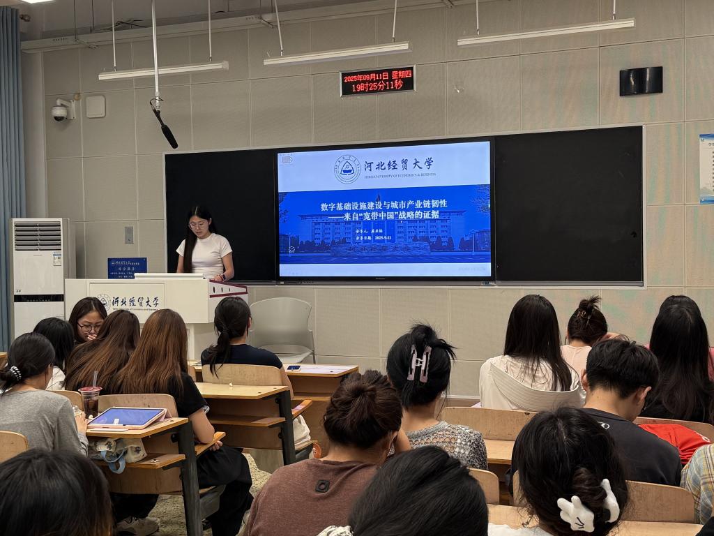 屈亚楠同学汇报了一篇发表在外文期刊《Sustainable Cities and Society》上的文献—《数字基础设施建设与城市产业链韧性——来自“宽带中国”战略的证据》这一文献。屈同学首先对研究背景进行了说明,这一研究能够为理解数字基础设施建设和产业链韧性之间的关系提供理论依据。该研究根据政策背景和理论分析提出相应假设,并通过交叠的DID模型验证了数字基础设施建设对产业链韧性的显著正向影响假设,最后提出政府扩大数字基础设施项目范围、加快数字技术和平台进步等建议。