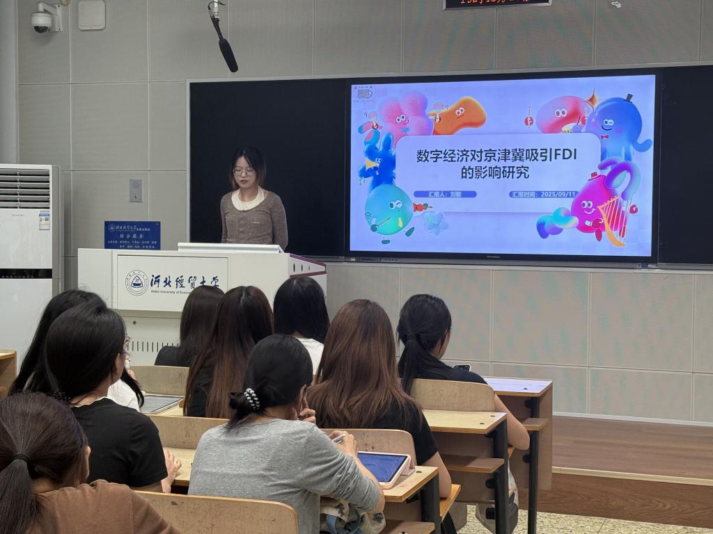 刘敏同学分享了自己所写的一篇文章:《数字经济对京津冀吸引FDI的影响研究》。首先,刘同学说明了京津冀地区数字产业的发展现状。当前数字经济是经济增长的关键力量,而京津冀地区数字产业呈现出“北京密集、天津过渡、河北外围”的阶梯分布,FDI呈现核心—外围的落差。刘同学针对这一现状进一步展开分析,该研究基于2010-2023年数据,通过基准回归、区域异质性等实证分析验证数字经济发展水平对京津冀吸引FDI有显著正向影响,并针对此结论提出要强化数字经济协同发展机制等建议,夯实吸引FDI的硬件基础。