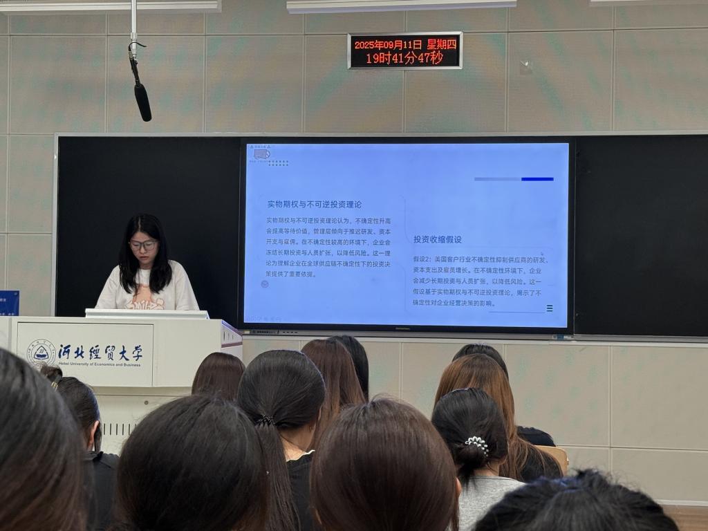 王舒展同学分享的是《经济研究》上的一篇文章—《全球供应链关系中的行业不确定性对中国企业的影响——基于中美供应链关系的研究》。该同学从研究背景、理论机制与假说、研究设计、实证结果、结论与政策启示五个方面对该文章进行介绍。近年来,逆全球化思潮涌动,贸易保护主义抬头,叠加地缘政治冲突不断,全球供应链的稳定性受到前所未有的挑战。文章基于成本粘性理论提出利润侵蚀假说,基于实物期权和不可逆投资理论提出投资收缩假设,基于信息传播理论提出股权收益预测假说。文章从金融市场的文本大数据出发,对行业经济不确定性进行剖析和测度,从而分析外部不确定性对国内企业的影响以及跨国传导机制。最后,文章提出建立预警平台、实施多元化战略、加强企业自身抗风险能力和内生韧性建设、完善资本市场监管并鼓励供应链相关金融产品创新等政策建议。