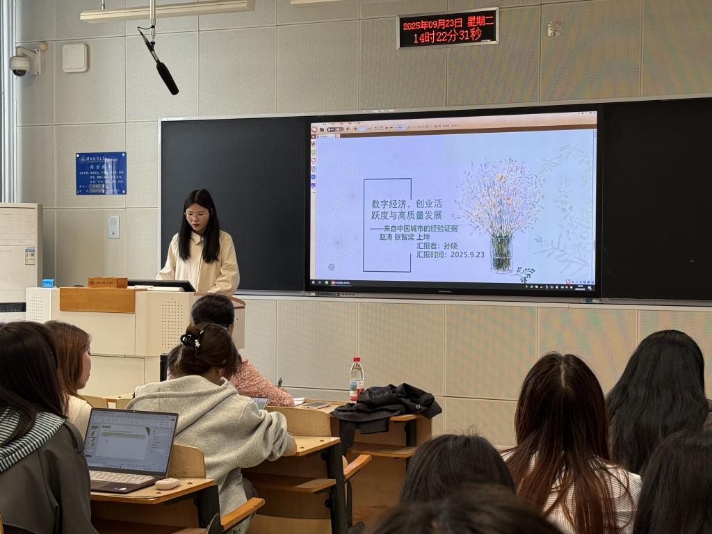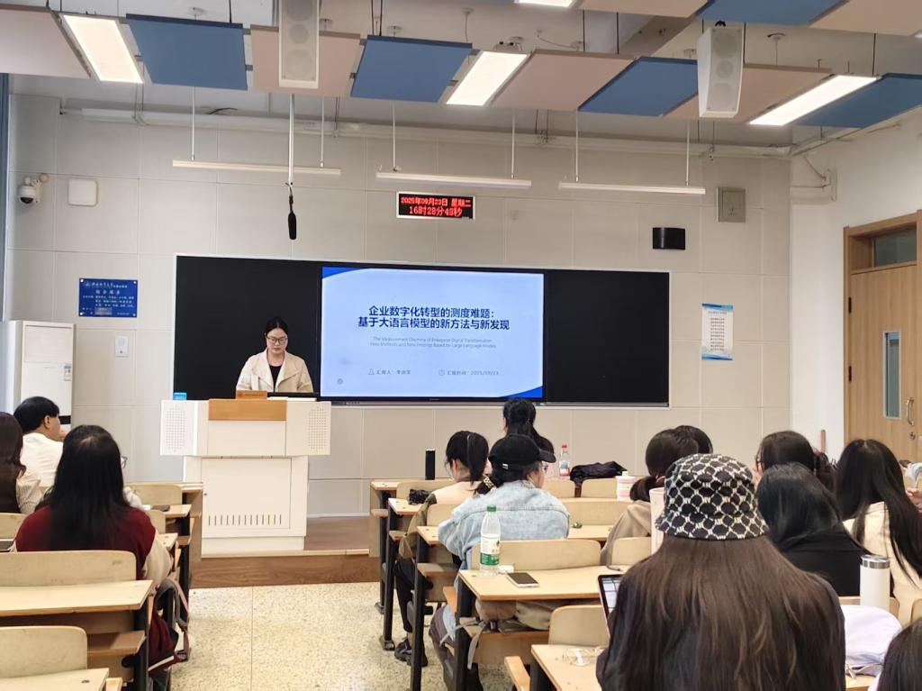 李函笑同学分享了一篇发表在《经济研究》上的《企业数字化转型的测度难题:基于大语言模型的新方法与新发现》的文章。该同学从研究背景与测度难题、新测度方法、发现与结论等几个方面对该文章进行了介绍。在数字经济背景下,首先由于现有客观数据法、时间冲击法、词典法等测度方法难以复制且相互冲突,针对此提出了ERNIE这一新方法,其包括数据准备、句库构建、人工标注、模型训练与选择、指标构建五步流程;然后通过实证发现企业数字化转型能够显著提高财务绩效,最后提出政府、企业和学界要通力合作,企业要不断进行数字化转型等政策启示。