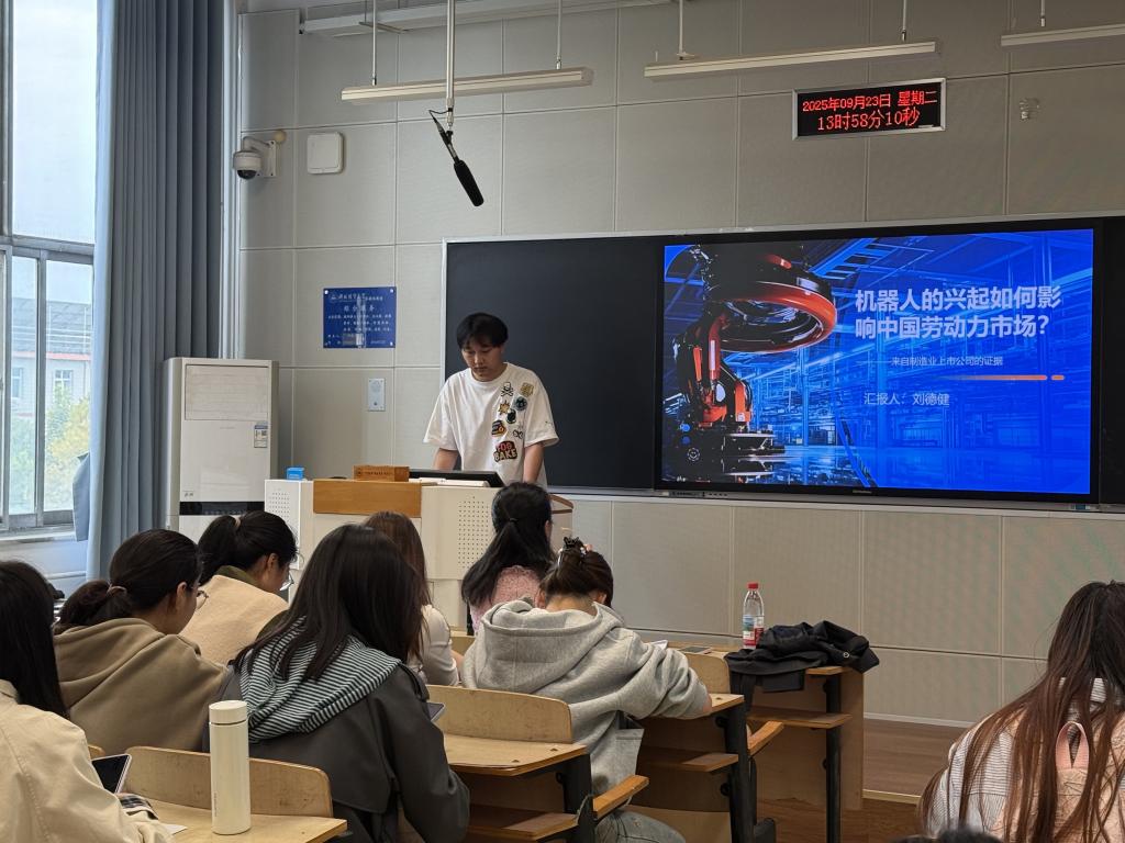 李鑫同学分享了一篇名为《机器人的就业效应:机制与中国经验》的文章,并从引言、理论机制分析、实证分析和结论等方面进行介绍。该同学首先对本文的研究背景作了简单介绍,当前机器人技术快速发展,对就业造成一定的冲击,这也是经济学关注的重点;文章通过基准回归、机制效应检验机器人如何影响就业,并通过双重差分的方法进行机器人影响就业的因果效应识别;研究发现,机器人使用显著提升了中国工业企业的就业水平,存在行业和技能的异质性,并且机器人主要通过产出规模扩张效应产生影响,以上结果经检验后依然显著。