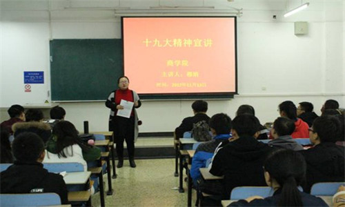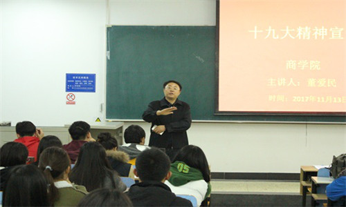 11月13日晚,商学院在第三教学楼B302教室举行十九大精神宣讲主题党课,党课分别由商学院党委副书记董爱民、商学院辅导员穆娟、校十佳大学生孙立同学授课,商学院学生党员、入党积极分及学生代表100余人参加。
