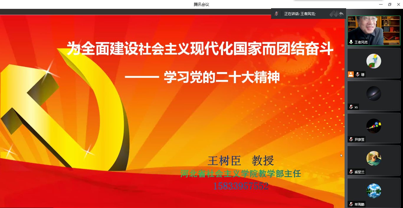 12月6日,商学院邀请河北省社会主义学院王树臣教授通过线上作党的二十大精神宣讲,学院党委书记马兵林主持,全体教职工线上参会学习。