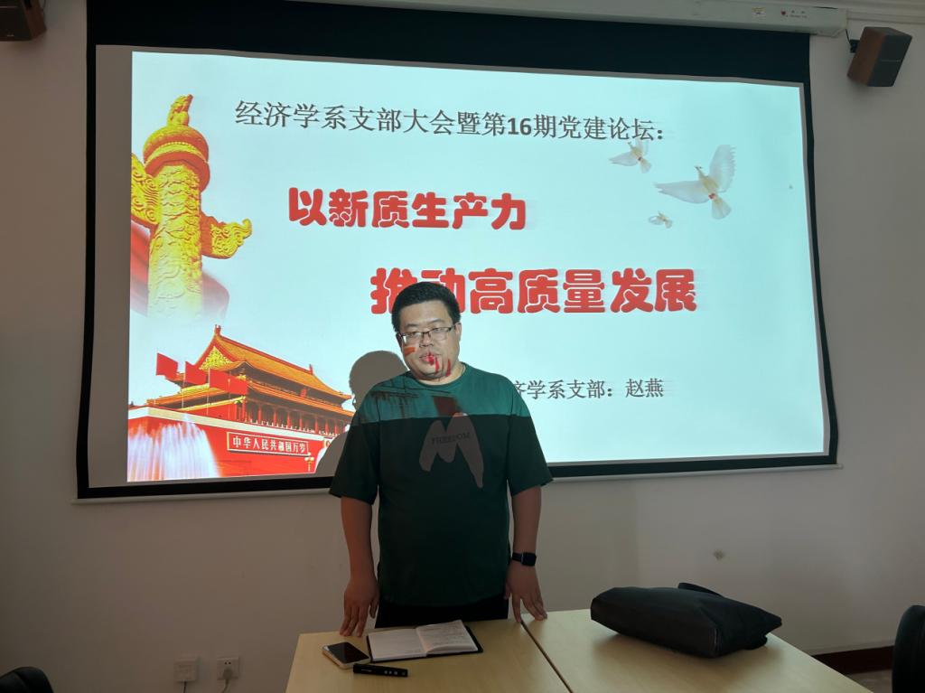 随后,赵培红进行了总结发言。他指出,第一,新质生产力的相关理论与经济学专业的科学研究关系密切,可以为今后的课题申报提供指导方向,将着力点放在研究省、市、县各级如何因地制宜培育和发展生产力上。第二,新质生产力与我系课程教学改革发展紧密相关,号召教师党员及时将新质生产力的相关论述融入课堂教学,实现课程思政常讲常新。第三,及时引导学生将新质生产力的相关内容与个人的社会实践、科研项目和学术竞赛相结合,与社会接轨,与时代同行。