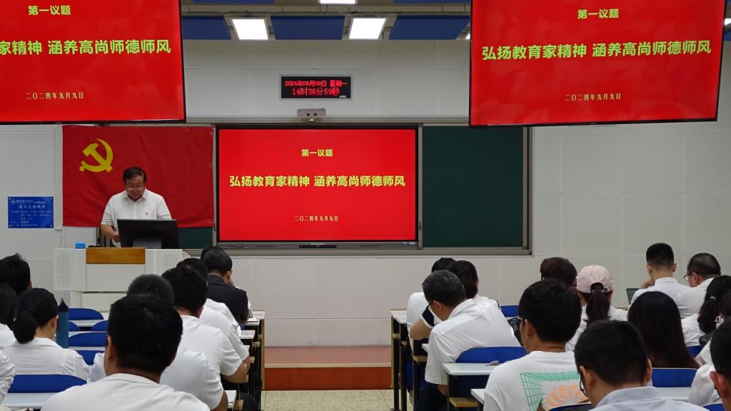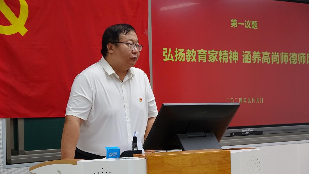 大会在庄严的国歌声中拉开帷幕。会议第一项议程进行“第一议题”集体学习,学院党委书记刘振滨以“弘扬教育家精神,涵养高尚师德师风”为题,带领全体党员认真学习习近平总书记关于教育的重要论述和《中共中央 国务院关于弘扬教育家精神加强新时代高素质专业化教师队伍建设的意见》的文件精神,从坚持师德师风第一标准、引导教师自律自强、加强师德师风培养、坚持师德违规“零容忍”四个方面进行重点阐释。他强调,教师党员要充分发挥先锋模范作用,大力弘扬教育家精神,涵养高尚师德师风,将教育家精神转化为思想自觉、行动自觉,牢记为党育人、为国育才的初心使命,努力培养能够担当民族复兴大任的时代新人。