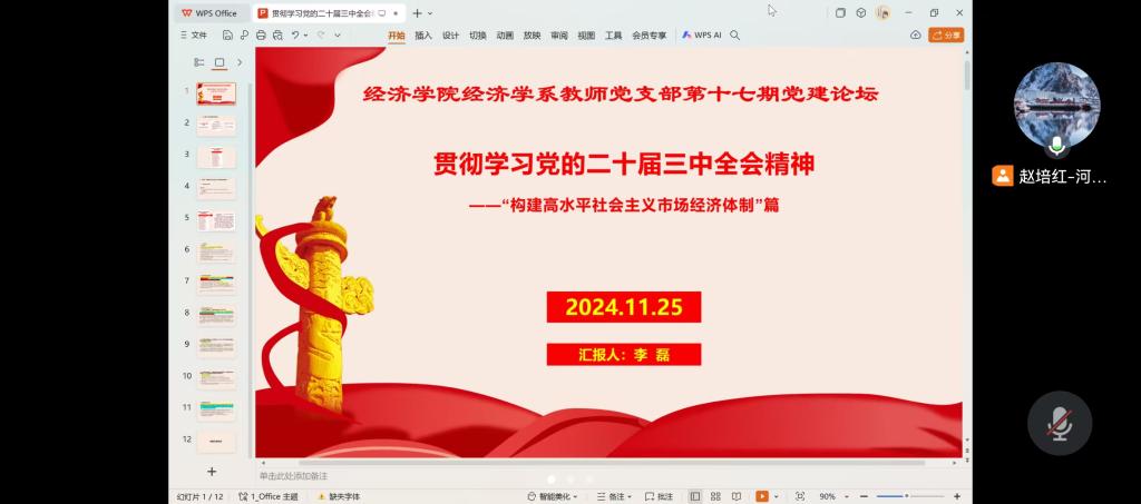 11月25日,经济学系教师党支部举办了第十七期“党建论坛”。本次大会以学习“二十届三中全会精神”为主题,由支部党员李磊主讲,支部书记赵培红主持,支部全体党员参加。