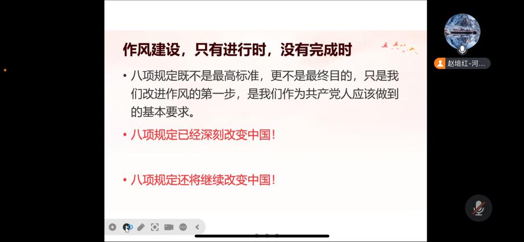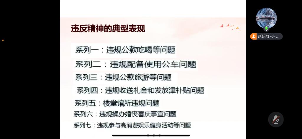 赵培红首先从中央八项规定精神从何而来谈起。党的十八大以来,以习近平同志为核心的党中央直面党内存在的种种问题,从制定和执行中央八项规定破题,解决了新形势下作风建设抓什么、怎么抓的问题;党的十九大之后,党中央又针对新情况新问题,修订了中央八项规定实施细则,继续落实中央八项规定精神;党的二十大对契而不舍落实中央八项规定精神作出部署,再次释放了作风建设只有进行时、没有完成时的强烈信号。接下来,赵培红介绍了中央八项规定的具体内容,包括要改进调查研究、改进会风、改进文风、规范出访活动、改进警卫工作、改进新闻报道、严格文稿发表、厉行勤俭节约。同时,着重强调了中央八项规定和中央八项规定精神之间的差异,中央八项规定精神实质是:厉行勤俭节约、反对奢侈浪费和奢靡之风、廉洁从政、工作作风务实等,与此相违背的,就是违反了中央八项规定精神。最后,赵培红结合违反中央八项规定精神的典型表现对支部党员提出了三点要求:一要系统学习,掌握规定;二要自我剖析,心有所畏;三要联系工作,聚焦需求。