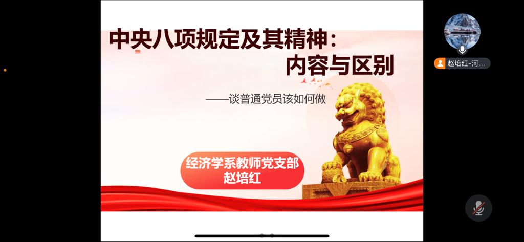 为深入学习贯彻中央八项规定精神,进一步巩固和深化主题教育和党纪学习教育成果,3月28日,经济学系教师党支部开展了“学习贯彻中央八项规定精神”主题党日活动。支部书记赵培红主持并讲授专题党课《中央八项规定精神:内容与区别——谈普通党员该如何做》,支部全体党员参加。