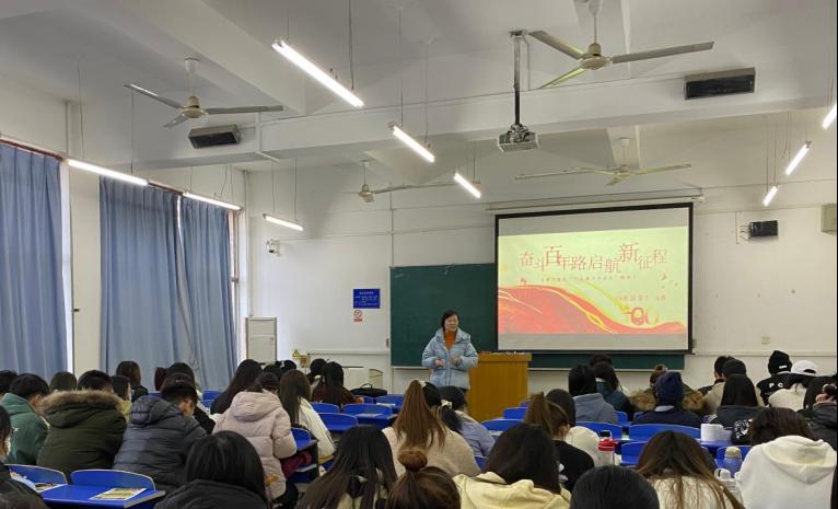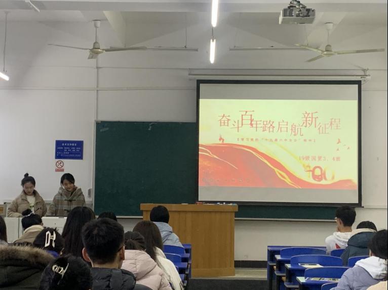 2021年11月8日至11日,党的十九届六中全会在北京举行,一系列蓝图目标、战略布局、工作部署,激动人心、催人奋进。作为当代大学生如何学习领会好全会精神,走好新时代赶考路,答好新时期发展卷呢?为深入贯彻党的十九届六中全会精神,进一步践行和弘扬社会主义核心价值观,培养大学生们的爱党爱国情怀,2021年11月24日,商学院2019级国贸三、四班开展“奋斗百年路 启航新征程”---学习党的十九届六中全会精神主题班会,辅导员李珊珊以及19国贸三、四班全体学生参加此次班会。