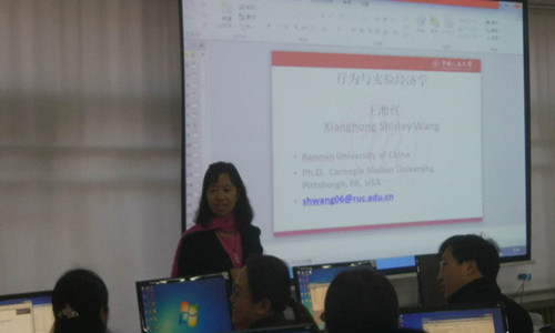 教授王湘红老师授课。王湘红老师师从行为经济学家Linda Babcock和George Loewenstein。2006年回国任教,教授行为和实验经济学、计量经济学等课程,主要研究兴趣包括用行为和实验经济学,公共政策,消费行为等。American Economic Review, Journal of Economic Behavior and Organization,China Economic Review审稿人、世界行为经济学学会中国区代表:The Society for the Advancement of Behavioral Economics、北京市消费者权益保护法研究会常务理事、世界经济论坛全球议程理事会行为分会委员。在行为与实验经济学中具有资深的技术底蕴和专业背景。来自全国40多位青年教师系统讲解目前行为经济学和实验经济学教学研究方法和科研写作策略,旨在提高青年教师在实践教学中的实验经济学教学水平以及科研能力。