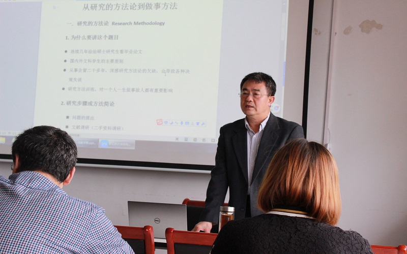 张景智结合自己修改硕士论文的经验、对比国内外文科学生的主要差别和从事企业管理多年的经验,指出研究方法的训练对做事做人都有重要作用。张景智从文献调研、确定具体问题及假设、一手资料搜集、数据处理、统计验证五个方面,详细阐释了研究步骤及方法总论。最后,他结合自己社会生活实际,以创业、创新、领导决策、书法、比赛为例,进一步论证了研究方法训练是思维方式和做事方法的训练,并得出重要结论:一是无论做人还是做事,方法论训练是非常必要的;二是文献学习使我们快速进入问题前沿,站在巨人肩膀上;三是要善于调查和观察,没有调查就没有发言权。会后,张景智与师生进行了互动交流。