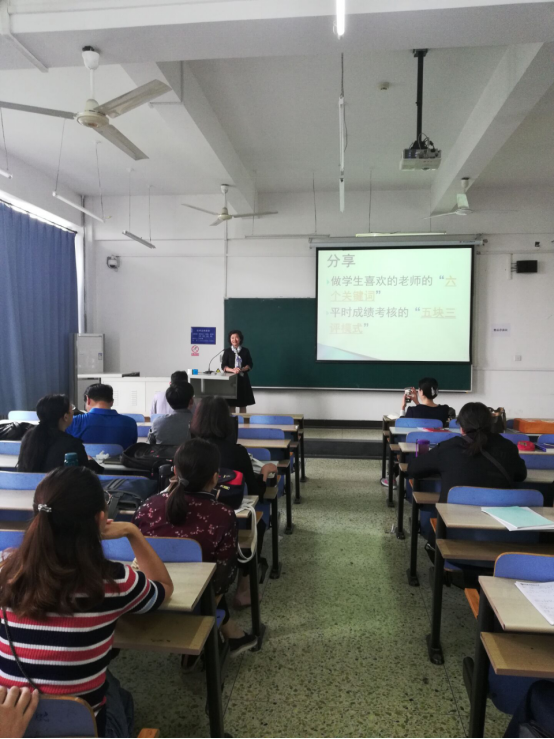 李英教授结合自己的经历和体会,讲了两个方面的内容:一是做一个好老师的六个关键词;二是介绍自己独创的平时成绩考核的“五块三评”模式。六个关键词是梦想、责任、坚持、认真、热爱、记录。这是李教授多年教学工作的总结。她以自己个人切身经历说明,作为一个老师要有梦想,要勇于担当。热爱自己的职业,把职业当事业。要用认真、积极的人生态度去唤醒学生,引导学生。 “五块三评模式” 是李教授独创的平时成绩考核的方法体系。“五块”是指平时考核的六个模块,包括考勤、作业、课堂小测、课程论文和期中考试等;“三评”是指三个评价主体及其在评价中的作用,即老师主评、助教辅评、学生互评。平时考核是教学评价的一种形式,是嵌入在教学过程中的,是教学过程的一部分,具有教学诊断与导向的功能。
