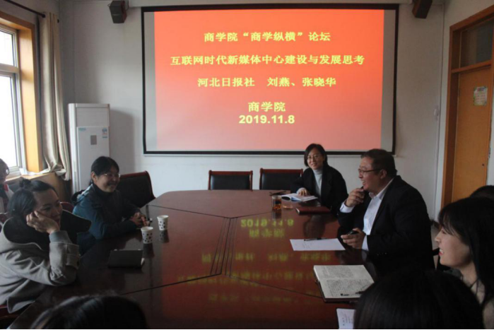 11月8日,河北日报社刘燕、张晓华两位主任编辑应商学院邀请,于西会议室作了题目为“互联网时代新媒体中心建设与发展思考”的学术报告。商学院刘振滨副院长、侯彦利副书记、党务办公室主任李珊珊及新媒体中心学生参加。会议由刘振滨副院长主持。