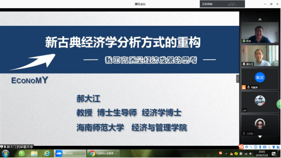 7月10日,海南师范大学经济与管理学院博士生导师郝大江教授应商学院邀请,于线上作了题为“我国高质量发展的经济学思考:新古典经济学范式的中国重构”的学术报告。报告由商学院副院长刘振滨主持,学院30余名师生参加。