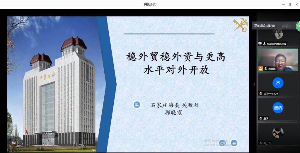 郭晓霞结合自己对外贸领域的研究,深入浅出地讲解了稳外贸、稳外资与更高水平对外开放的相关问题。郭晓霞认为,外需大幅萎缩、出口缺少新的增长点、国际竞争日趋激烈和国内稳外贸、稳外资的基础仍不够牢固是当前中国稳外贸面临的严峻挑战;全球价值链撤退、让步于区域价值链、企业回流、生产性资产的跨境投资下降的风险加大、新冠肺炎疫情对全球外商直接投资的流动造成巨大的冲击和影响是当前中国稳外资面临的严峻挑战。尽管如此,中国在稳外资和稳外贸方面依然有市场庞大,处于全球供应链体系的核心位置,有较高的配套能力、基础设施能力、人力资源的劳动生产力,改革开放的红利,综合性吸收外资的优势,跨径电商的大量出现等有利条件。郭晓霞指出,稳外贸、稳外资是“六稳”中很重要的两项内容,不仅直接针对外贸外资工作,而且还与“六保”中的保市场主体、保粮食能源安全、保产业链供应链稳定、保居民就业密切相关,外贸外资在我国经济发展中具有重要地位。因此,我国应当通过以制度型对外开放提升吸引力和竞争力;充分发挥国内自贸试验区与国际自由贸易区对接的“双自联动”效应;发挥消费大市场优势,提升外资吸引力;发挥数字经济优势,推动跨境电商发展;以线上线下融合,打造新的比较优势;落实世贸组织贸易便利化协定,提升贸易便利化程度;对标主要经济体,全面推进法治化营商环境等措施实现稳外资和稳外贸。郭晓霞还从保市场主体,为稳外贸稳外资打下坚实基础;保产业链供应链稳定,增强我国产业竞争力;优化口岸营商环境,促进高水平对外开放三方面讲解了石家庄海关稳外贸、稳外资的措施。