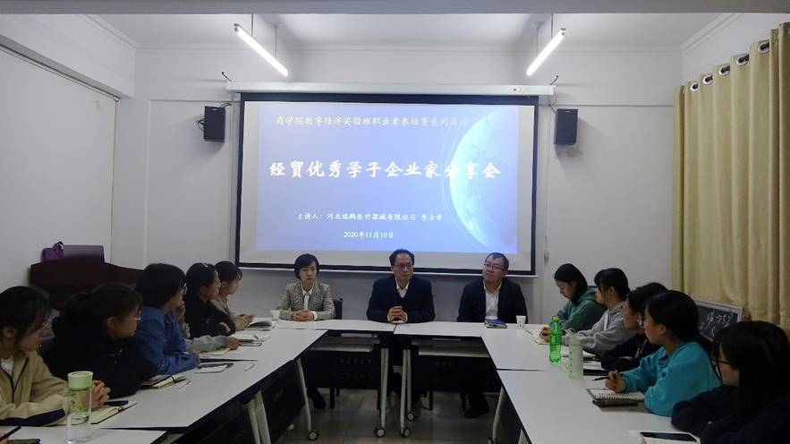11月10日下午4点,商学院在三办中会议室举行经贸优秀学子企业家分享会。商学院院长王小平、河北瑞鹤医疗器械有限公司人力资源总经理李士章及数字经济实验班部分同学参加,分享会由商学院党委副书记侯彦利主持。