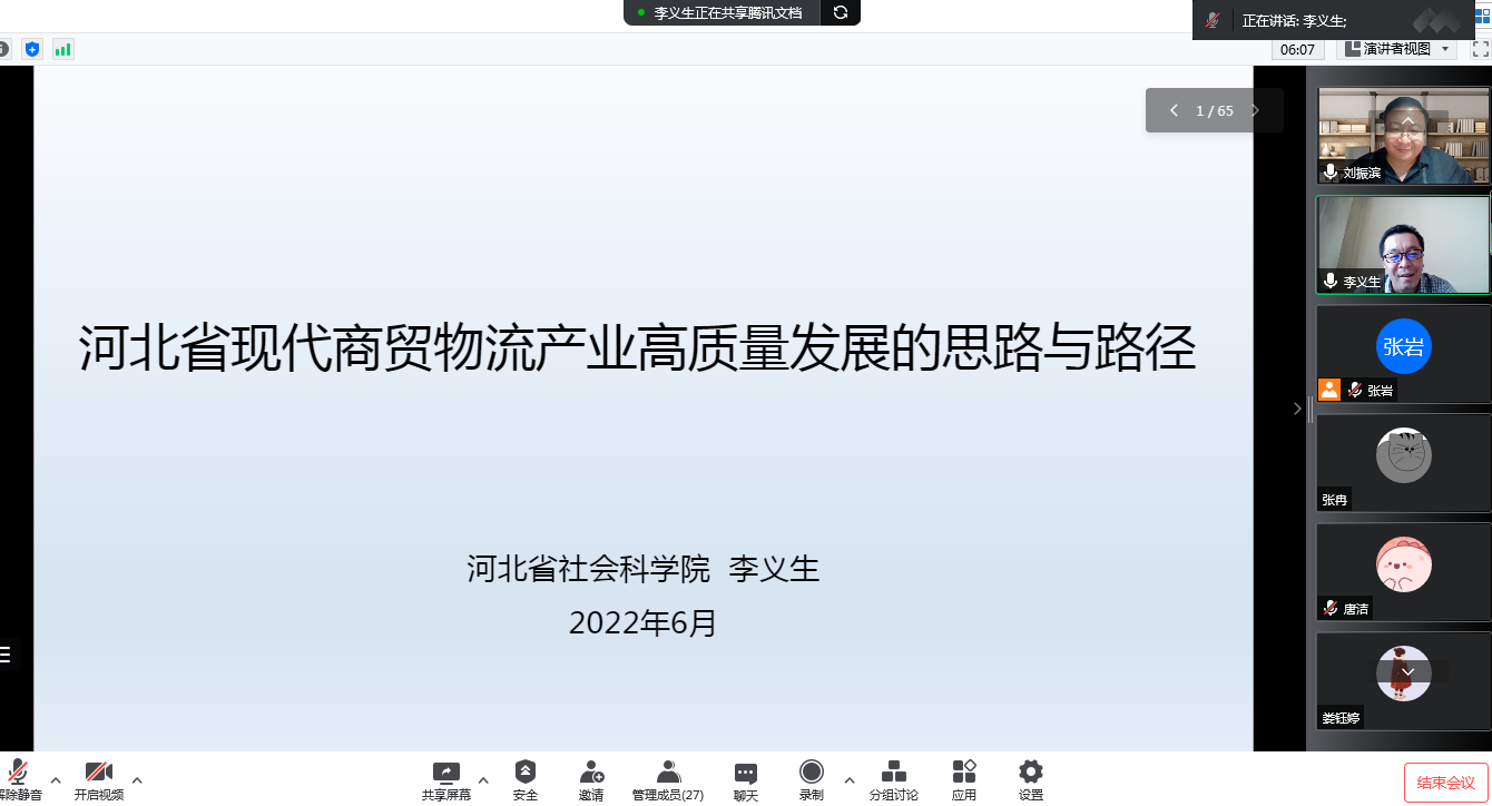 6月10日,河北省社会科学院李义生研究员应商学院邀请,于线上作了题为“河北省现代商贸物流产业高质量发展的思路与路径”的学术报告。报告由刘振滨副院长主持,学院四十余名师生参加。