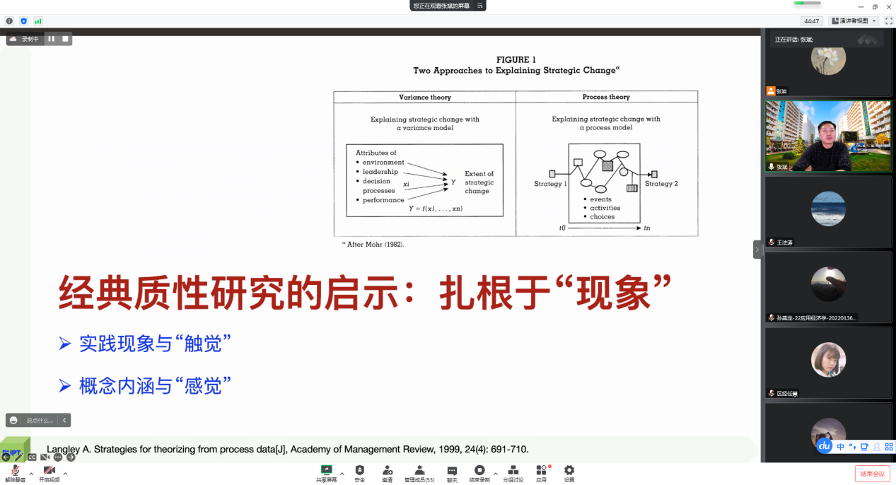 张斌首先分享了周雪光田野调查、《街角社会》、《决策的本质》等经典质性研究,并比较了Eisenhardt、Gioia和Langley三种案例研究范式的理论构建,综合上述案例,张斌认为案例研究能够全方位锻炼研究人员的各种能力,有利于培养学术性人才和致力于业界发展的学生。其次,张斌从理论检验与理论构建、单案例和多案例的理论构建两个角度阐释了理论构建的内涵。最后,张斌选择了数字企业、混合所有制企业、通信运营商作为案例分析对象,阐释双案例研究在理论构建中的一些思路和逻辑。
