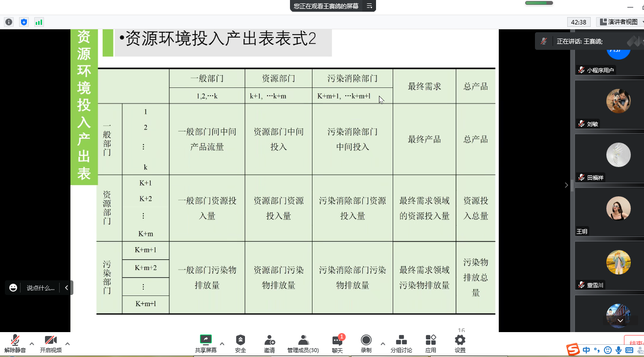 王赛鸽首先讲解了生态经济学研究的必要性,他指出,人类经济社会高速发展的同时,带来了资源枯竭、环境污染等问题,因此,经济学研究必须与可持续发展道路相结合。其次,王赛鸽从人类生态经济系统、生态系统的经济特性、生态经济系统的规律性三方面讲解了生态经济学的主要内容,并介绍了我国的生态建设成就。最后,王赛鸽以城市能源-水资源耦合模型构建为例,阐释环境-经济跨系统模型构建中的一些思路和逻辑。