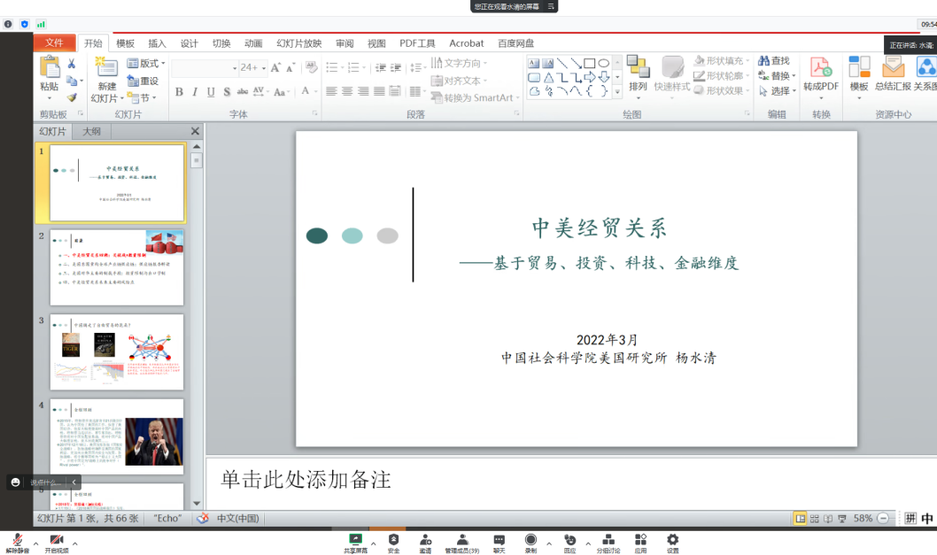 3月21日,中国社科院美国研究所杨水清博士应商学院邀请,于线上作了题为“解读中美经贸关系:基于贸易、投资、科技、金融等维度”的学术报告。报告由国际商务专硕导师组组长高云龙副教授主持,全校五十余名师生参加。