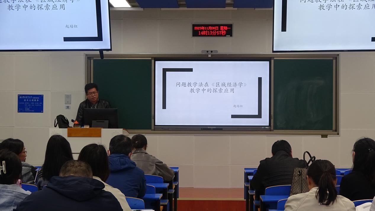 2023年11月6日下午,商学院在北三教B102教室举办了题为《问题教学法在〈区域经济学〉教学中的探索应用》教学沙龙活动。沙龙活动由经济学系赵培红老师主讲,教学副院长单海鹏主持,全校40余名教师参加。